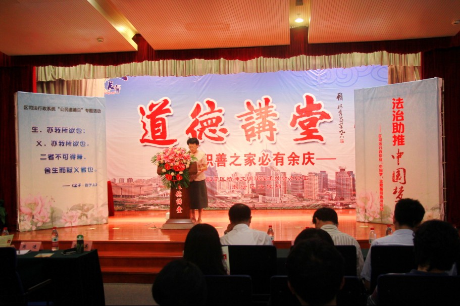 9月24日上午,為慶祝全國(guó)第十一個(gè)“公民道德日”,結(jié)合“中國(guó)夢(mèng)”主題群眾性基層宣講活動(dòng)和“第三屆上海市好心人節(jié)”主題活動(dòng),區(qū)司法局聯(lián)合區(qū)文明辦、文化局共同舉辦區(qū)司法行政系統(tǒng)“法治助推中國(guó)夢(mèng)”專題道德講堂活動(dòng)。地點(diǎn)設(shè)在位于長(zhǎng)寧區(qū)圖書館的區(qū)道德講堂總堂,主持活動(dòng)的是上海海耀律師事務(wù)所周若蒙律師。出席的領(lǐng)導(dǎo)有區(qū)司法局黨委書記王軍、區(qū)文明辦副主任符雪峰等,參加人員還有區(qū)文明辦部分同志,局系統(tǒng)13家市區(qū)級(jí)文明單位代表,局機(jī)關(guān)和法律援助中心全體人員,各基層黨組織黨支部書記和黨務(wù)助理,區(qū)眾扶協(xié)會(huì)、人民調(diào)解協(xié)會(huì)、新航社工站代表以及東虹橋法律服務(wù)園區(qū)黨員代表共計(jì)一百余人。
