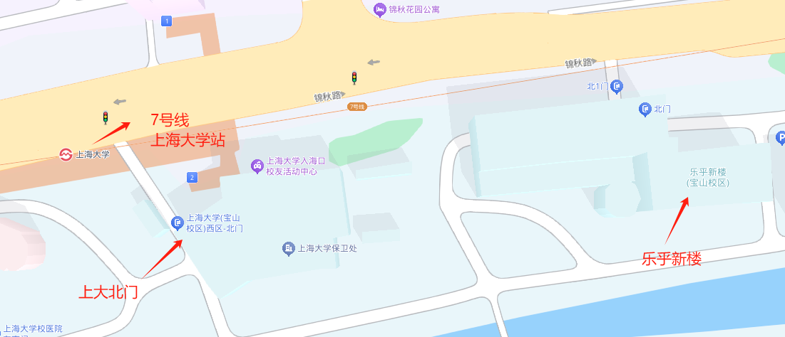 由上海市寶山區錦秋路716號(北門)進入上海大學,樂乎新樓毗鄰北門