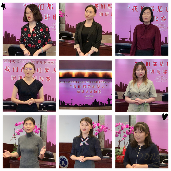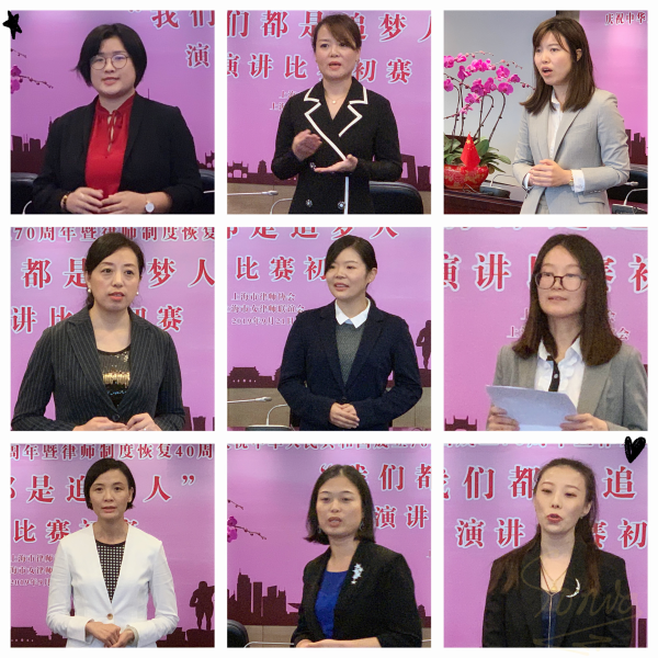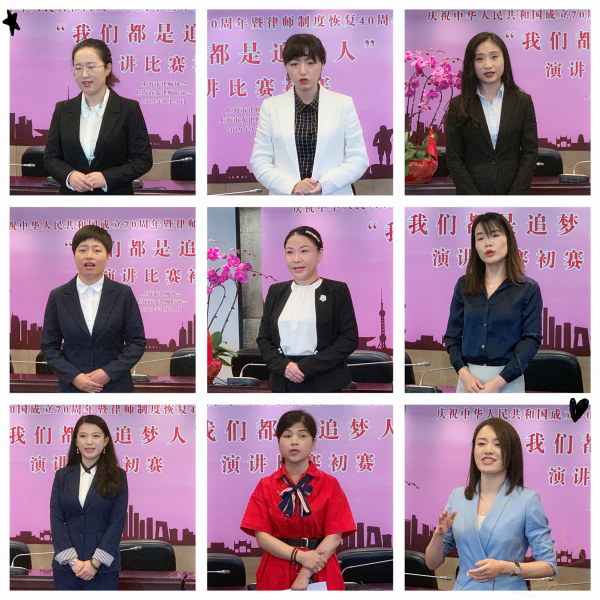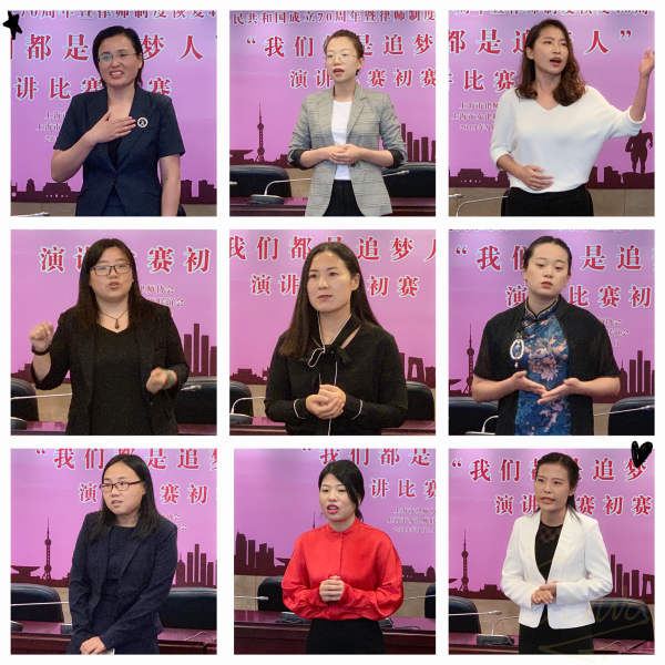 2019年9月21日,慶祝中華人民共和國成立70周年、律師制度恢復40周年系列活動之“我們都是追夢人”上海市女律師演講比賽初賽在上海市律師協會報告廳舉行。此次活動由上海市律師協會、上海市女律師聯誼會主辦,參賽選手由各律師工作委員會推選,共計44名女律師參加了初賽。