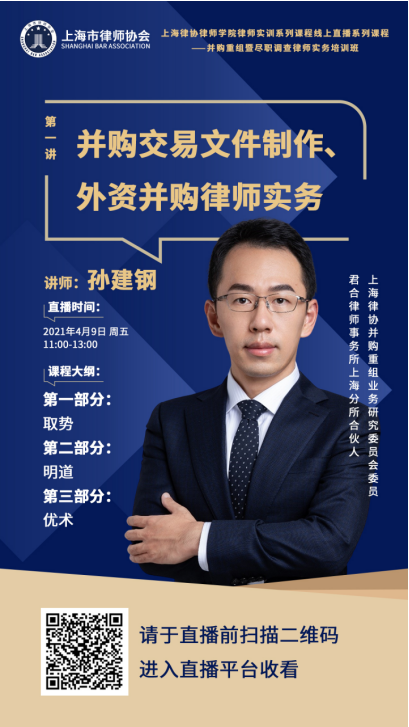 2021年4月9日,上海律協律師學院聯合并購重組業務研究委員會共同舉辦并購重組暨盡職調查律師實務培訓班(第一、二講),累計近3,000人次參與直播觀看本次課程。