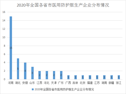 其中,河南省是我國醫用防護服生產企業主要聚集區,該區域醫用防護服獲批企業數量為15個,湖北省醫用防護服獲批企業數為5個,安徽省醫用防護服獲批企業數為4個,山東省醫用防護服獲批企業數為3個,江西、河北、天津、廣東四省醫用防護服獲批企業數僅為2個。
