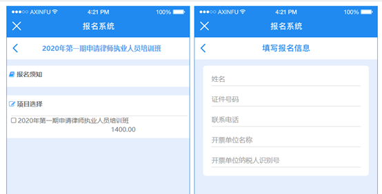 2、正式登陸后,選擇繳費項目“2020年第一期申請律師執業人員培訓班”。