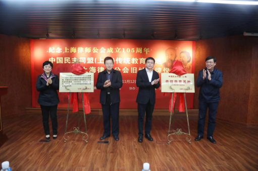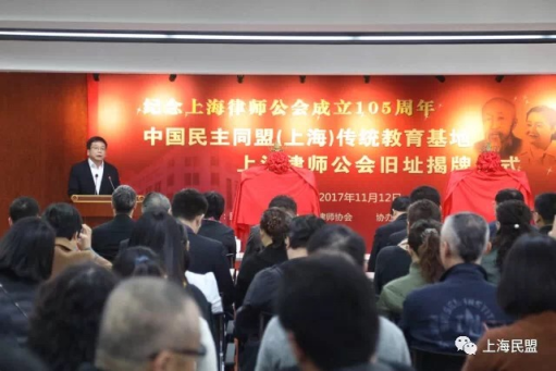 為紀(jì)念上海律師公會(huì)舊址成立105周年,11月12日上午,中國(guó)民主同盟(上海)傳統(tǒng)教育基地揭牌儀式在上海律師公會(huì)舊址舉行。本次活動(dòng)由民盟上海市委、上海市律師協(xié)會(huì)主辦,黃浦區(qū)司法局、民盟黃浦區(qū)委協(xié)辦。全國(guó)人大常委、民盟中央副主席張平,上海市副市長(zhǎng)、民盟上海市委主委陳群,中共黃浦區(qū)委書記、區(qū)長(zhǎng)杲云,中共上海市委統(tǒng)戰(zhàn)部副部長(zhǎng)王玨出席儀式并共同為教育基地揭牌。上海市副市長(zhǎng)、民盟上海市委主委陳群,上海市司法局副局長(zhǎng)、上海市律師協(xié)會(huì)黨委書記王協(xié),上海市律師協(xié)會(huì)會(huì)長(zhǎng)俞衛(wèi)鋒出席儀式并講話。儀式由民盟上海市委專職副主委沈志剛主持。來(lái)自民盟黃浦區(qū)委、民盟上海市第一、第二司法系統(tǒng)委員會(huì)的60余位盟員共同見(jiàn)證了揭牌儀式。儀式結(jié)束后,大家一同參觀了上海律師公會(huì)舊址陳列室。