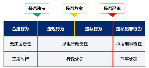其中,(一)、(二)類所涉及的“走私犯罪”、“走私行為”、“違規(guī)行為”,是在談及進(jìn)出口企業(yè)涉海關(guān)法律風(fēng)險(xiǎn)時(shí)經(jīng)常出現(xiàn)的三個(gè)概念,它們之間的關(guān)系可由下圖予以說明。