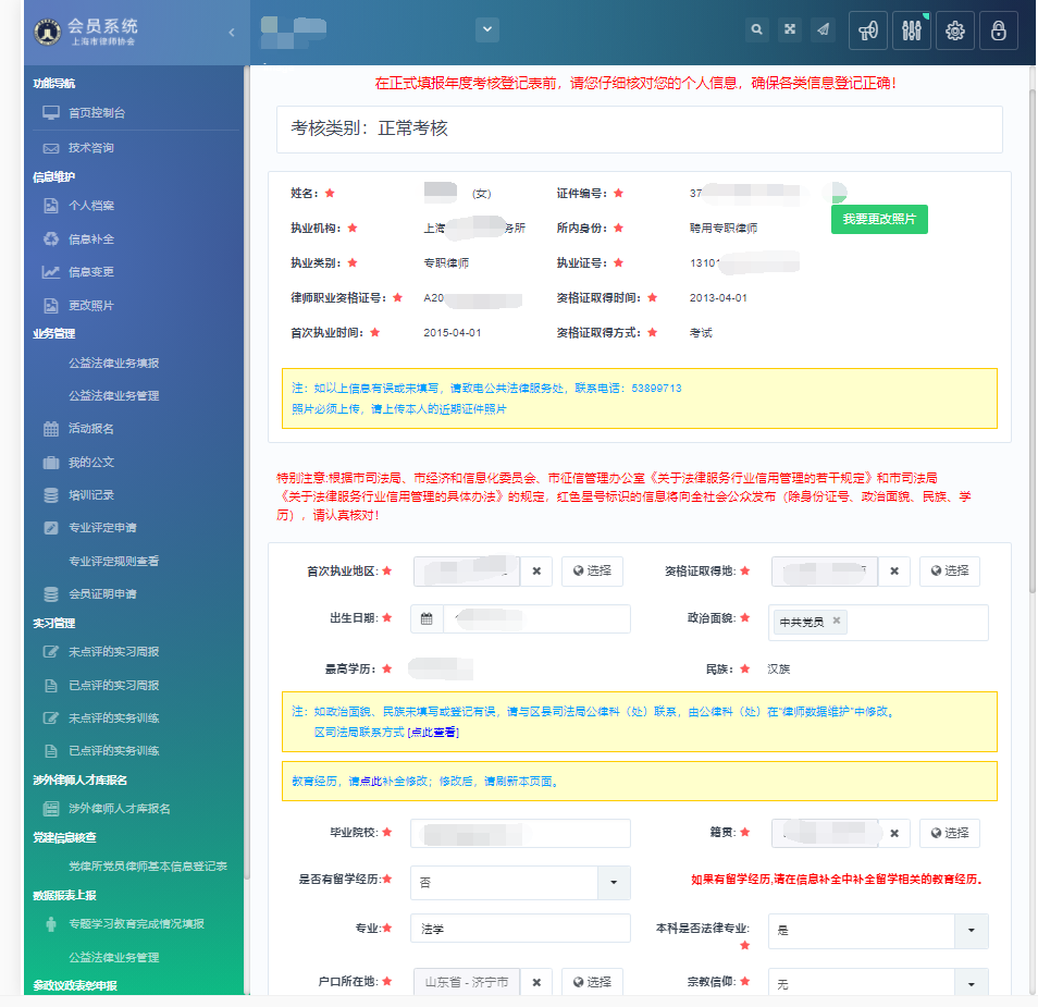 律師需仔細核對《律師執業年度考核登記表》上的各項信息,其中標注紅色“*”的項目為必填項。