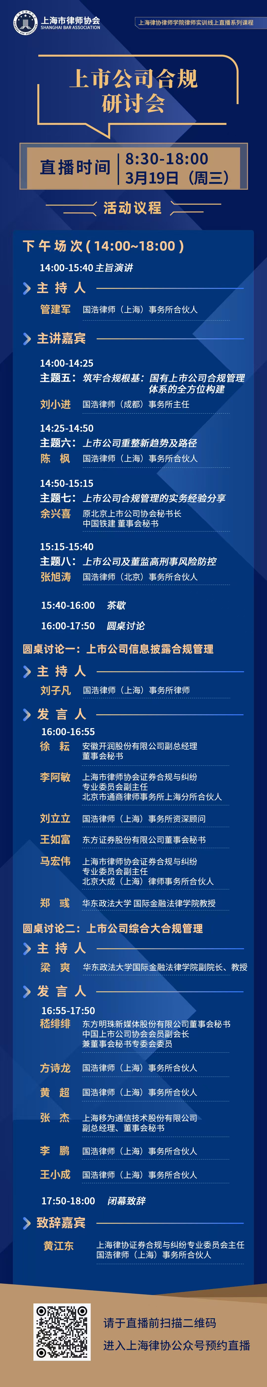 基于此,上海律協證券合規與糾紛專業委員會舉辦“上市公司合規”研討會,為建立健全良性高效的上市公司合規體系,更好服務資本市場高質量發展貢獻智慧與力量。具體安排如下: