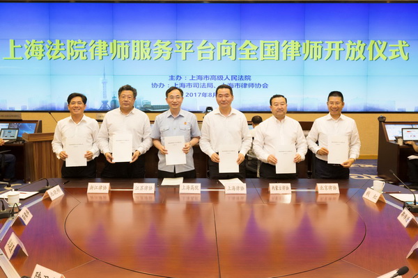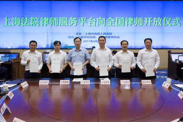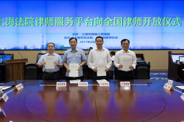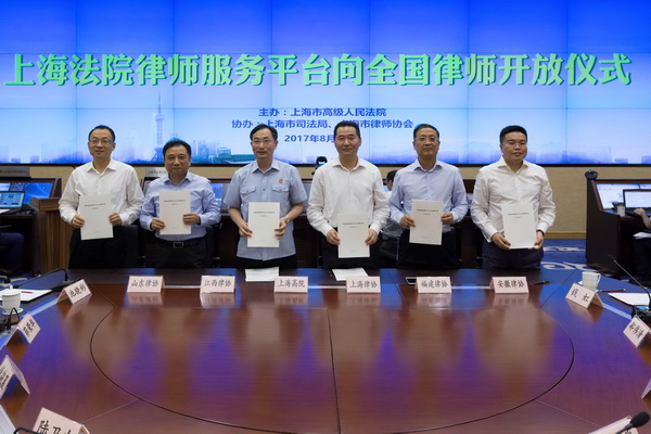 2017年8月2日下午,上海法院律師服務平臺向全國律師開放儀式在上海市高級人民法院隆重舉行。本次儀式由上海市高級人民法院主辦,上海市司法局、上海市律師協會協辦。最高法院黨組成員、副院長姜偉,上海高院黨組書記、院長崔亞東,上海市委政法委副書記章華,上海市司法局黨委書記、局長陸衛東,中華全國律師協會副會長呂紅兵等出席了此次開放儀式。儀式由上海高院黨組成員、副院長郭偉清主持,姜偉、崔亞東講話,陸衛東、呂紅兵以及作為外省市律師協會代表的浙江省律師協會會長鄭金都發言,上海高院黨組成員、副院長茆榮華介紹平臺建設過程和主要功能。