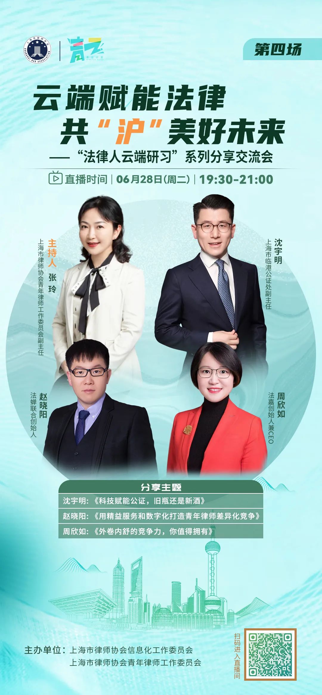 本次收官之作,我們特別邀請(qǐng)到了來(lái)自法律科技、公證、資深法務(wù)等不同領(lǐng)域的分享嘉賓,為大家?guī)?lái)《云端賦能法律 共“滬”美好未來(lái)》話(huà)題分享,期許跨界視角的碰撞能為法律人帶來(lái)更多靈感和思考。