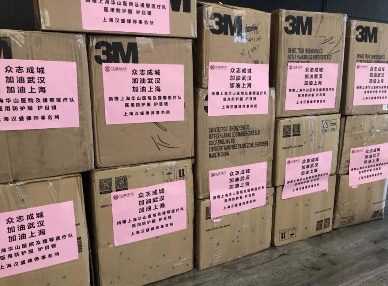 新冠肺炎疫情牽動著上海市聯合律師事務所全體律師的心。在號召全體律師用實際行動支援抗疫,向事務所全體成員發起捐款倡議的同時,聯合所發動全所律師的資源,在國內外尋找符合一線抗疫需要的醫用物資。經過不懈努力,終于定向采購到1,000件符合國標的醫用防護服。為確保每一件防護服都用到實處、送到需要的人手上,聯合所決定將1,000件防護服定向捐贈給復旦大學附屬華山醫院、中山醫院援鄂醫療隊。3月7日,該批防護服通過醫院專用物資通道送往武漢。二十五箱捐助物資上印有“青山一道同云雨,明月何曾是兩鄉——上海人民為滬上援鄂醫療隊加油”。