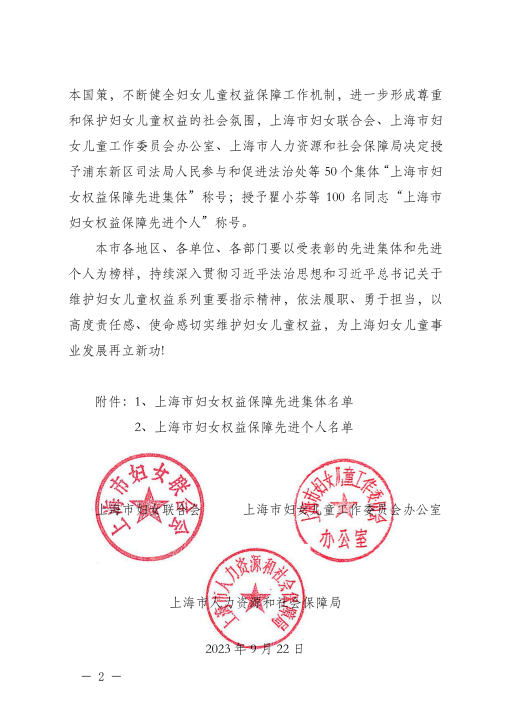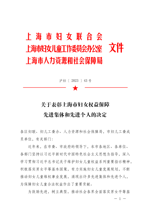 近日,在上海市婦女聯合會、上海市婦女兒童工作委員會辦公室、上海市人力資源和社會保障局主辦的維護婦女兒童權益先進集體和先進個人評選活動中,黃浦區女律師聯誼會獲評“上海市婦女權益保障先進集體”榮譽稱號。