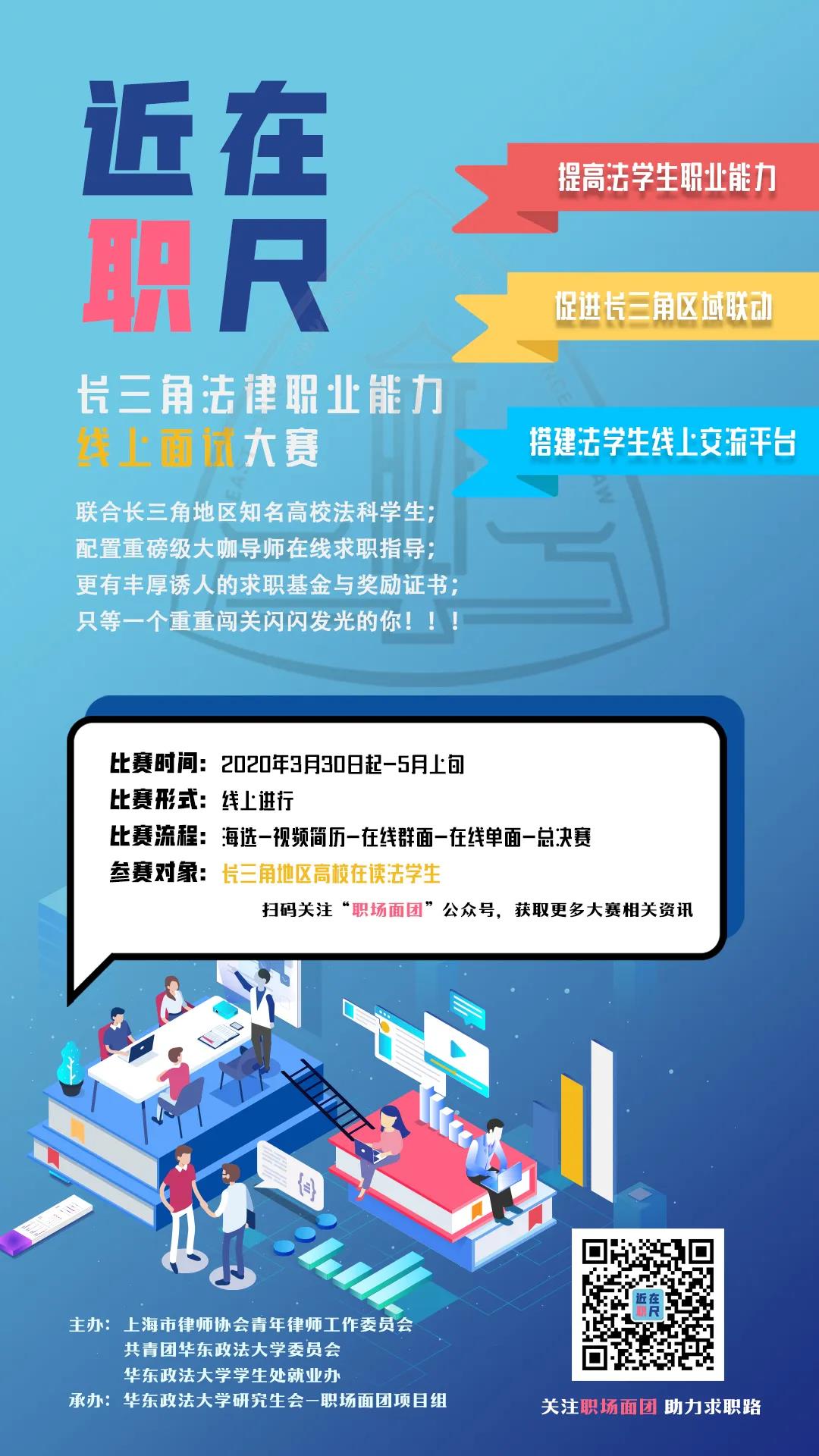 為提高法學(xué)生求職能力與職業(yè)素養(yǎng),增進(jìn)長(zhǎng)三角地區(qū)法學(xué)生交流互動(dòng),由上海市律師協(xié)會(huì)青年律師工作委員會(huì)、共青團(tuán)華東政法大學(xué)委員會(huì)、華東政法大學(xué)學(xué)生處就業(yè)辦聯(lián)合主辦,華東政法大學(xué)“職場(chǎng)面團(tuán)”項(xiàng)目組承辦,長(zhǎng)三角地區(qū)部分高校參與協(xié)辦的首屆“近在‘職’尺”長(zhǎng)三角法律職業(yè)能力線上面試大賽(簡(jiǎn)稱“大賽”)正式拉開帷幕?。?!
