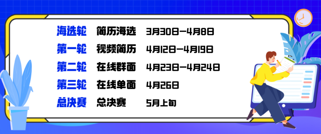 本屆大賽最終解釋權(quán)歸主辦方所有。欲了解更詳細(xì)的大賽進(jìn)程,請(qǐng)關(guān)注“職場(chǎng)面團(tuán)”公眾號(hào)。(注:本次大賽旨在提升大學(xué)生職業(yè)能力,不承諾提供實(shí)習(xí)、就業(yè)崗位)