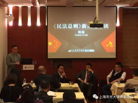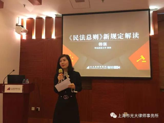 2017年4月14日,上海市光大律師事務所舉辦《民法總則》新規解讀講座,特邀了知名法學家、華東政法大學教授、華東政法大學比較民法與判例研究所所長、碩士研究生導師、法學博士韓強教授,圍繞《民法總則》的具體內容作專題講座。參與本次講座的有來自國內外知名企業以及相關部門的法律工作者,包括上海質監局、星巴克、好時、TOTO、前程無憂等。本次講座由上海市光大律師事務所合伙人沈靜主持。