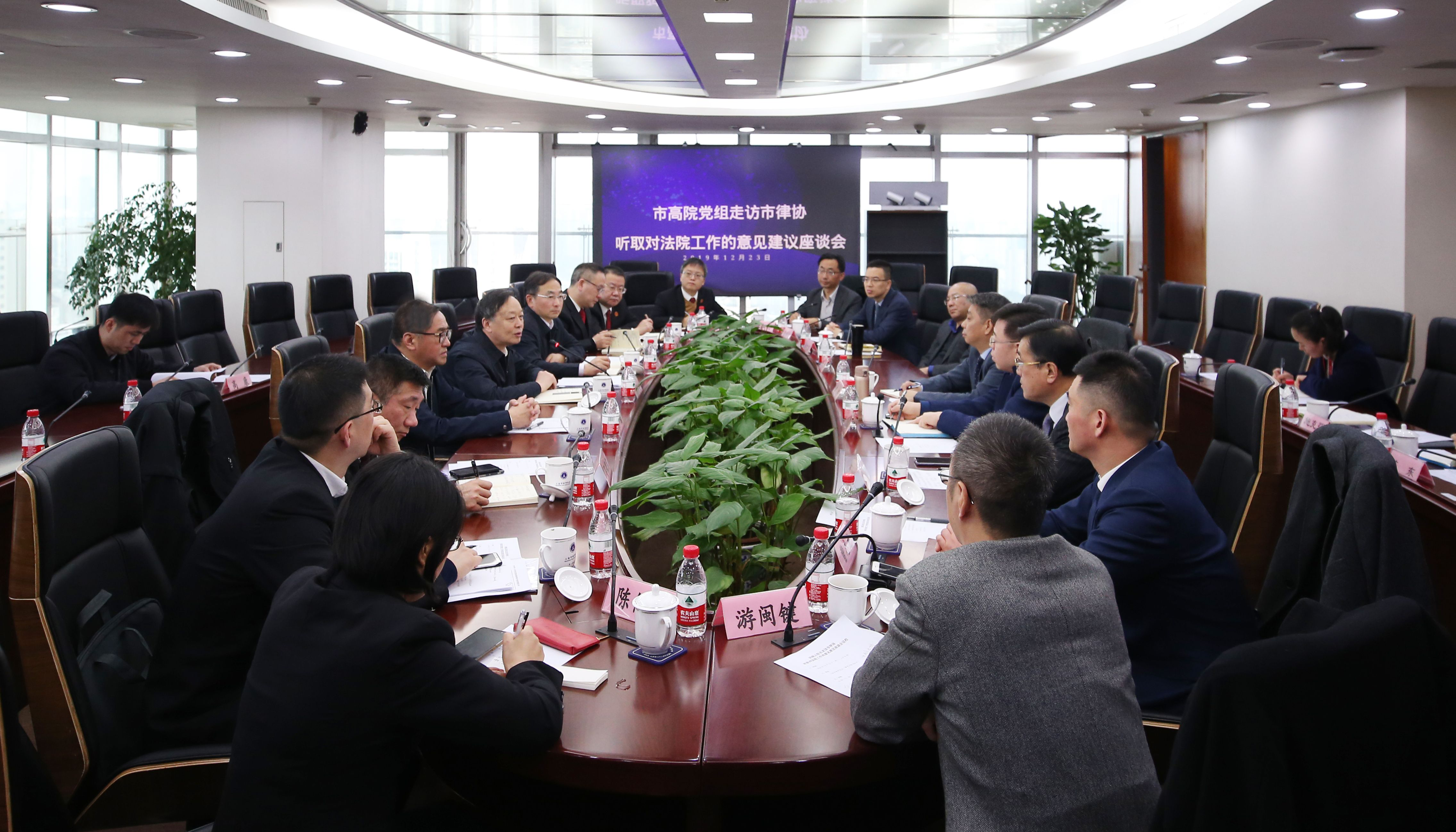2019年12月23日上午,上海市高院黨組書記、院長劉曉云,黨組副書記、副院長茆榮華,黨組成員、副院長張斌及相關庭室負責人一行到市律協(xié)走訪交流,聽取對法院工作的意見建議。會議由市高院副院長張斌主持。市律協(xié)會長季諾,監(jiān)事長張鵬峰,副會長陳峰、楊波、林東品、曹志龍、徐培龍等參加會議。