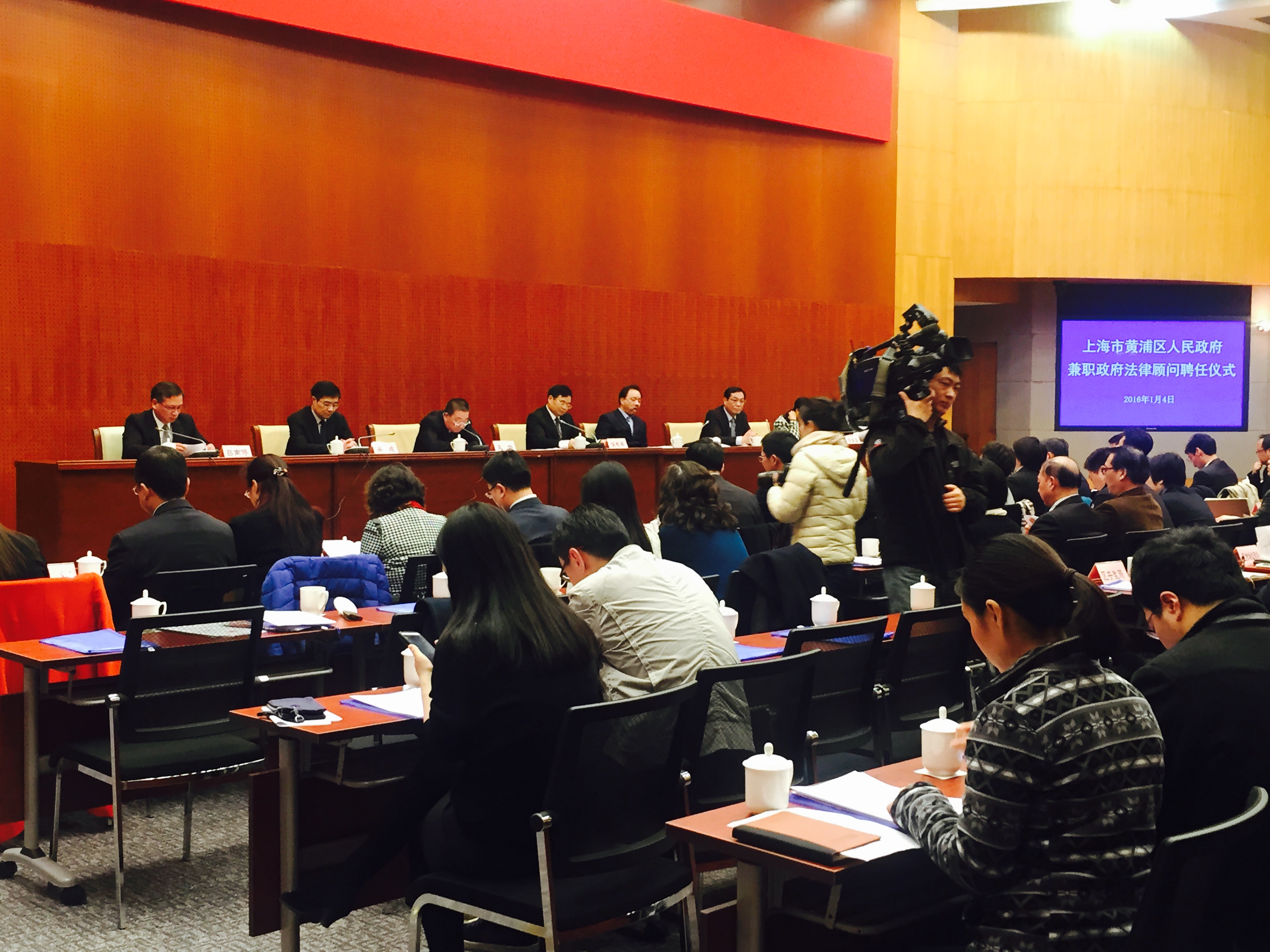 受聘儀式由黃浦區副區長呂南停主持,區委常委、副區長曹金喜介紹了黃浦區兼職法律顧問選聘工作情況,區委常委、副區長吳成,副區長程霄玉、胡廣杰,區政府各委、辦、局、街道辦事處主要負責人等參加聘任儀式。市政府法制辦副主任劉平、市司法局副局長王協到會并作了講話,黃浦區區長湯志平最后作了重要講話。