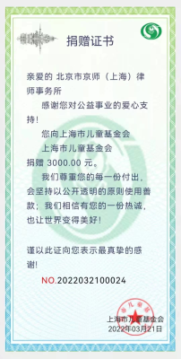 京師所王麗艷律師以律所的名義,向上海市兒童基金會捐款3000元。現在,這些愛心捐贈,已經送到了復旦兒科醫院醫護人員的手中。