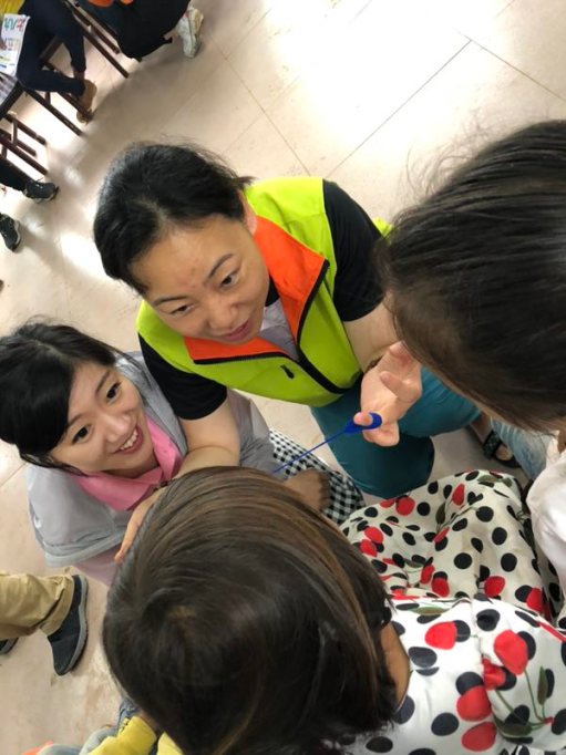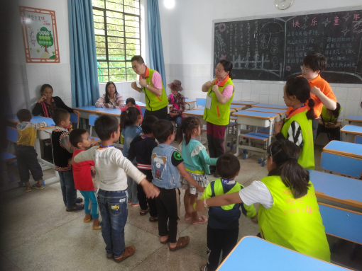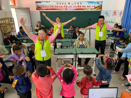 升旗儀式后,校長(zhǎng)對(duì)華夏匯鴻所的到來表示了感謝,同時(shí)希望來參加“入學(xué)體驗(yàn)營(yíng)”的學(xué)齡前兒童能夠有所收獲,也希望能夠有越來越多的人能夠關(guān)注到大山深處的孩子們的教育問題,并為這些孩子們的成長(zhǎng)成才提供力所能及的幫助。在體驗(yàn)課程上,美術(shù)組的老師們用折好的不同顏色的紙鶴、青蛙等工具讓孩子們認(rèn)識(shí)各種顏色,如何用普通話表達(dá);并在助教的幫助下,教孩子們給準(zhǔn)備好的空白圖畫上色,加深孩子們對(duì)不同色彩的印象。音樂組的老師和助教帶領(lǐng)孩子們學(xué)習(xí)《上學(xué)歌》,并結(jié)合所準(zhǔn)備的簡(jiǎn)單舞蹈動(dòng)作,讓孩子們?cè)诳鞓返母杪暫蜌g快的舞蹈中中學(xué)習(xí)和練習(xí)普通話。由于當(dāng)?shù)卮蟛糠值膶W(xué)齡前兒童以及家長(zhǎng)不會(huì)說普通話,陽(yáng)光善行公益事務(wù)中心的社工們?cè)缫言诋?dāng)?shù)卣业搅藥酌踔猩洚?dāng)小小志愿者當(dāng)課堂翻譯。在音樂課和美術(shù)課結(jié)束后,孩子們還在當(dāng)?shù)爻踔猩膸ьI(lǐng)下一起在小學(xué)的籃球場(chǎng)上了一節(jié)趣味體育課程。所有的課程結(jié)束后,在學(xué)校的食堂體驗(yàn)一次免費(fèi)午餐,這也是“入學(xué)體驗(yàn)營(yíng)”的一項(xiàng)重要環(huán)節(jié)。