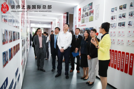 一邊聆聽京師上海黨支部書記鄧海虹的講解,一邊參觀和詢問。交流中,呂憶農(nóng)書記對京師上海的黨建工作表示了認可,對黨建長廊的內(nèi)容提出了完善意見。