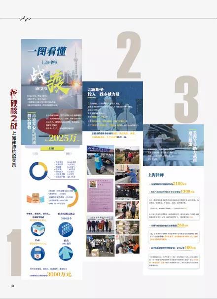本期抗疫特刊約11.5萬字,匯集106篇抗“疫”文章、近200張照片。主要分兩大版塊:版塊一為上海律師在上海市律師行業黨委和上海律協的組織引領下,從積極組織捐款捐物、參與志愿服務、踴躍建言建策、進行協調聯動到全力部署防控等方面的數據與實例匯總;版塊二為上海16個區百余家律師事務所,以及包括1268名黨員在內的萬余名律師參與疫情防控及開展法律服務的感人事跡展陳,以實際行動彰顯上海律師的家國情懷與社會責任擔當。在此,特別感謝上海律協各區律師工作委員會對本期抗疫特刊的大力支持。