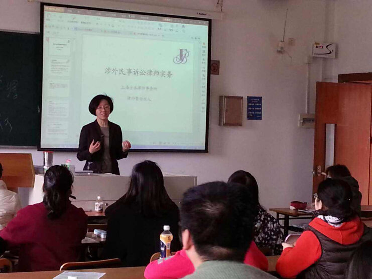 3月19日下午,華東政法大學2014-2015學年第二學期“律師執業技能”課程第三講,由長寧區律工委副主任、方本律師事務所主任范玉梅律師在華東政法大學松江校區為本科學生講授律師實務課程之“涉外民事訴訟律師實務”。