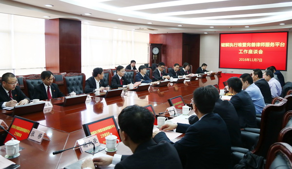 2016年11月7日上午,市高院與市律協在高院六樓會議室就“破解執行難暨完善律師服務平臺”工作召開專題座談會。市高院黨組書記、院長崔亞東,黨組成員、副院長郭偉清、茆榮華,執行局局長韓耀武、立案庭庭長麥玨、研究室主任張新等部門的領導出席會議。
