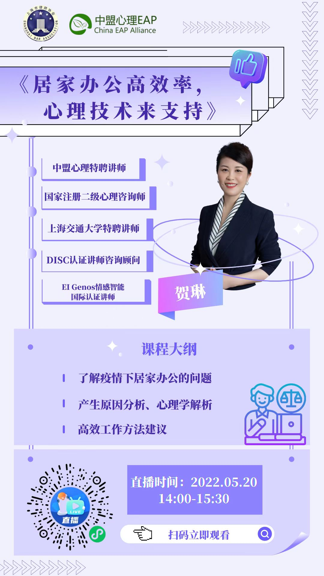 主講嘉賓:1、賀琳 :中盟心理特邀EAP講師 、國家二級注冊心理咨詢師 、上海交通大學特聘講師、DISC認證講師、EI Genos情感智能國際認證講師;