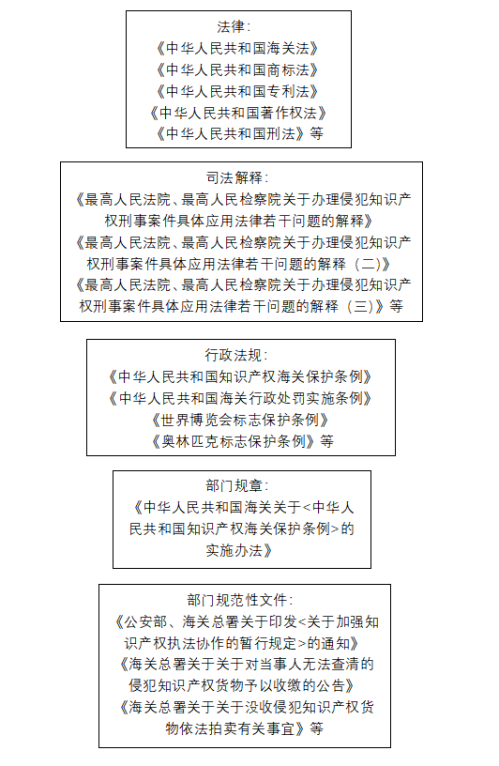 我國知識產權海關保護立法起源于二十世紀九十年代中期,經過這些年的發展,已形成法律、行政法規、部門規章、規范性文件等較為完善的法律體系,如下圖所示: