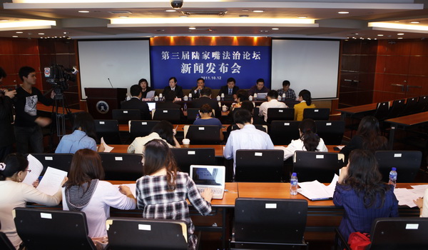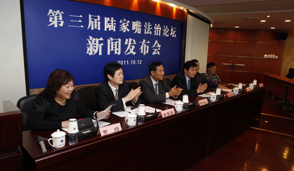 2011年10月12日下午,第三屆陸家嘴法治論壇新聞發布會在市律協35樓報告廳舉行。會議由市律協副會長、新聞發言人黃綺主持,中國海事仲裁委員會上海分會蔡鴻達秘書長,上海律協會長盛雷鳴會長,浦東新區司法局金更良副局長,上海律協副會長陳乃蔚、秘書長萬恩標、副秘書長劉小禾,浦東新區律公處副處長張玥,浦東新區律工委主任尹燕德、副主任俞衛鋒、副秘書長周波,中國海事仲裁委員會上海分會顧國偉等出席會議。