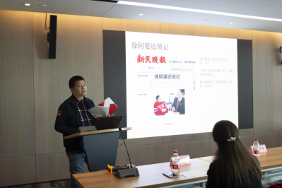 江躍中主任以“努力寫出可信、可親、可學的百姓典型”為主題,從他寫的通訊《徐阿婆還債記》引申開,寫通訊必須要深入調查研究,避免報道失真,同樣的素材可選取不同的表達方式,充分運用背景材料來寫作報道,寫好新聞報道的要素包括5個W和1個H。