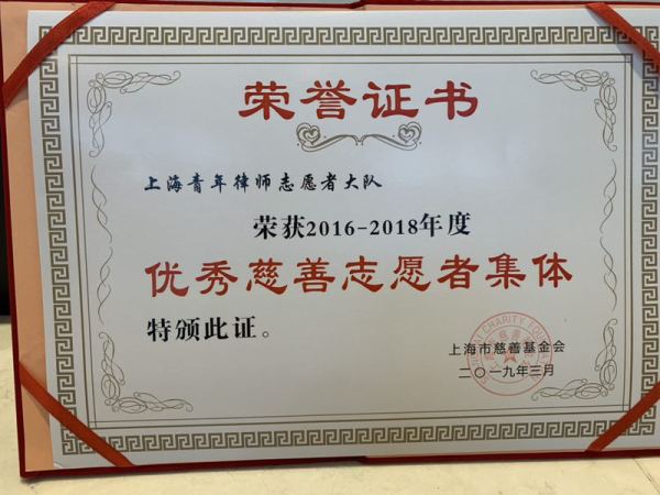 2019年3月9日,上海市慈善基金會、上海市慈善志愿服務總隊召開了“2016—2018年度優秀慈善志愿者”表彰大會。會議向40個優秀慈善志愿者集體、50名優秀慈善志愿者、30名優秀慈善志愿服務組織者頒發了榮譽證書。上海青年律師志愿者大隊榮獲“2016—2018年度優秀慈善志愿者集體”榮譽稱號。