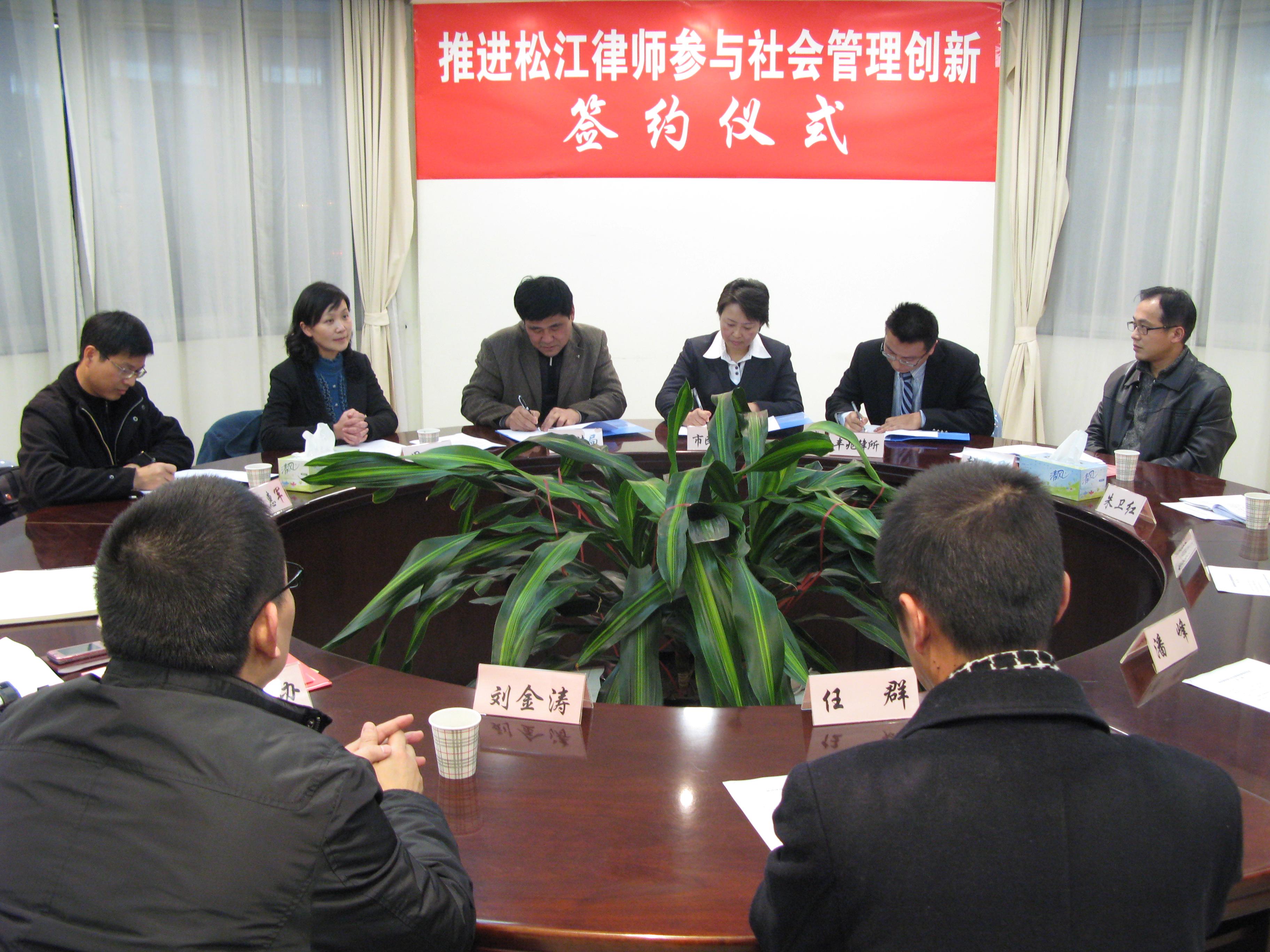 松江區(qū)司法局律工委牽頭社區(qū)辦、市民服務(wù)中心、律師事務(wù)所簽訂《發(fā)揮律師公共服務(wù)職能作用,推動律師參與社會管理創(chuàng)新備忘錄》和《法律服務(wù)協(xié)議書》