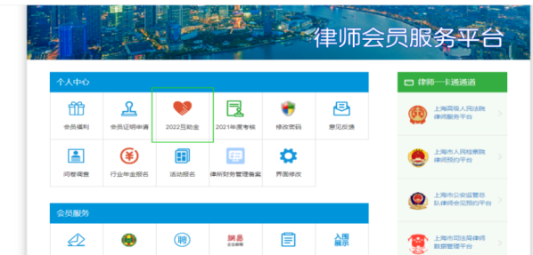 律師事務所登錄東方律師網,進入【會員中心】,選擇【202X互助金】模塊,點擊進入互助金報名頁面。如圖所示: