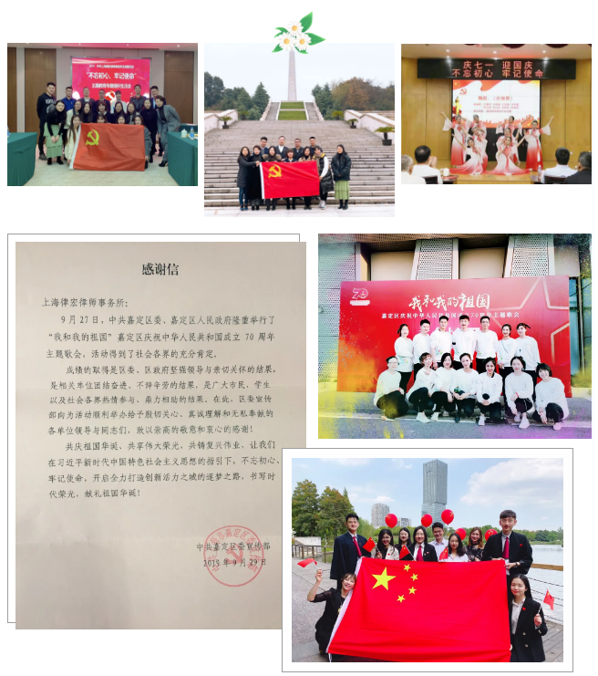 紅色教育培育愛國主義精神。組織全體黨員赴新四軍太湖游擊隊(duì)紀(jì)念館開展專題組織生活會,傳承紅色基因,弘揚(yáng)革命精神。會上,每名黨員簽署《律師執(zhí)業(yè)規(guī)范承諾書》,承諾遵守律師執(zhí)業(yè)規(guī)范,以更高的標(biāo)準(zhǔn)嚴(yán)格要求自己。利用業(yè)余時間組織學(xué)習(xí)舞蹈《紅梅贊》,參與區(qū)司法行政系統(tǒng)組織開展的各類主題黨日活動;全程參與“我和我的祖國”嘉定區(qū)慶祝中華人民共和國成立70周年主題歌會;市司法局微博在國慶當(dāng)天發(fā)布了律宏所拍攝的“我對祖國大聲表白”視頻,用優(yōu)美的舞姿、高昂的歌聲、動情的表演,抒發(fā)熱愛祖國、祝福祖國、建設(shè)祖國的真摯情懷。