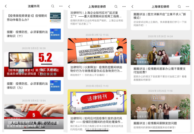 依法戰(zhàn)疫保障社會穩(wěn)定。律師為區(qū)衛(wèi)生健康委提供專業(yè)法律服務(wù)和支持,參與撰寫疫情通報,做好區(qū)疫情防控工作書面材料的法制審核。為做好疫情期間的法律宣傳、法律服務(wù),律宏所響應(yīng)區(qū)總工會的號召,相繼推出“毓秀嘉定·法治‘工’開課——防疫·微劇場、防疫·微課堂、防疫·微服務(wù)”,律師們拍攝了配套視頻,使企業(yè)和勞動者能更生動形象地了解和知曉特殊時期的法律規(guī)定。疫情期間,還相繼推出了法律特刊、圈圈講法、“防疫·直播間、防疫·微評估”等新舉措,采用在線直播課程的形式,構(gòu)建法治框架,提供律師在線解答和互動交流。并將繼續(xù)以“對標(biāo)新需求、整合新思路、運(yùn)用新媒體、開拓新渠道、引領(lǐng)新趨勢”為理念,“零距離”服務(wù)企業(yè)勞動用工合法合規(guī),“零距離”維護(hù)職工合法權(quán)益,協(xié)力推進(jìn)勞動關(guān)系和諧穩(wěn)定,更好維護(hù)疫情期間社會穩(wěn)定大局。