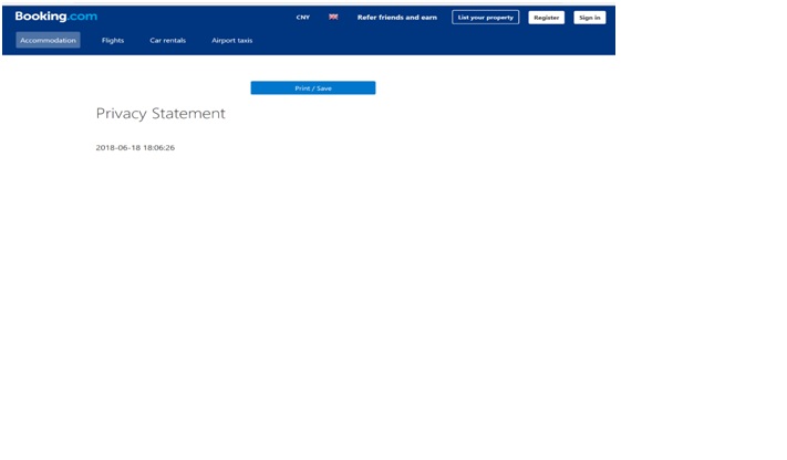 Booking在《隱私聲明》內容的最前面,即設置了“打印/保存”功能,易于用戶獲取隱私政策