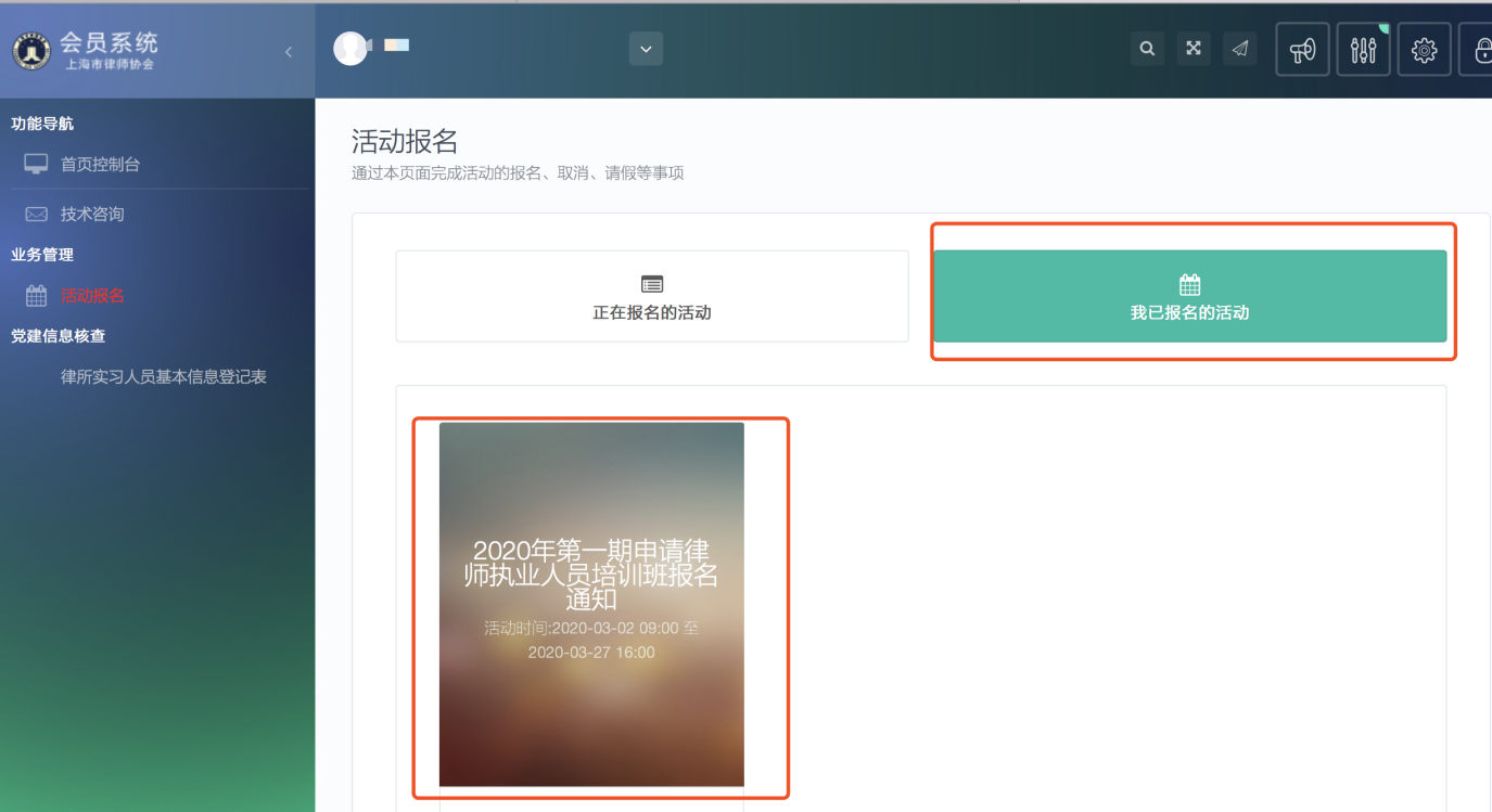 4、點(diǎn)擊“已報(bào)名活動(dòng)”,選擇“2020年第二期申請律師執(zhí)業(yè)人員培訓(xùn)班”,點(diǎn)擊“繳費(fèi)”;