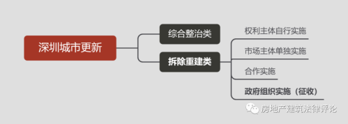 對于拆除重建類城市更新活動,《深圳市城市更新辦法實施細則》(深府〔2012〕1號)第三十三條規定了四種實施方式,其中“(四)政府組織實施”方式涉及到房屋征收。雖然該《實施細則》為原《深圳市城市更新辦法》的配套規定,但該第三十三條在《深圳市城市更新實施條例》于2021年3月1日正式施行后依舊得到沿用。