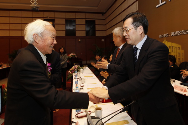 中共市委常委、市委政法委書記丁薛祥,副市長、市公安局長張學兵、市法學會會長吳光裕、中華全國律師協會會長王俊峰為獲獎老律師頒獎。