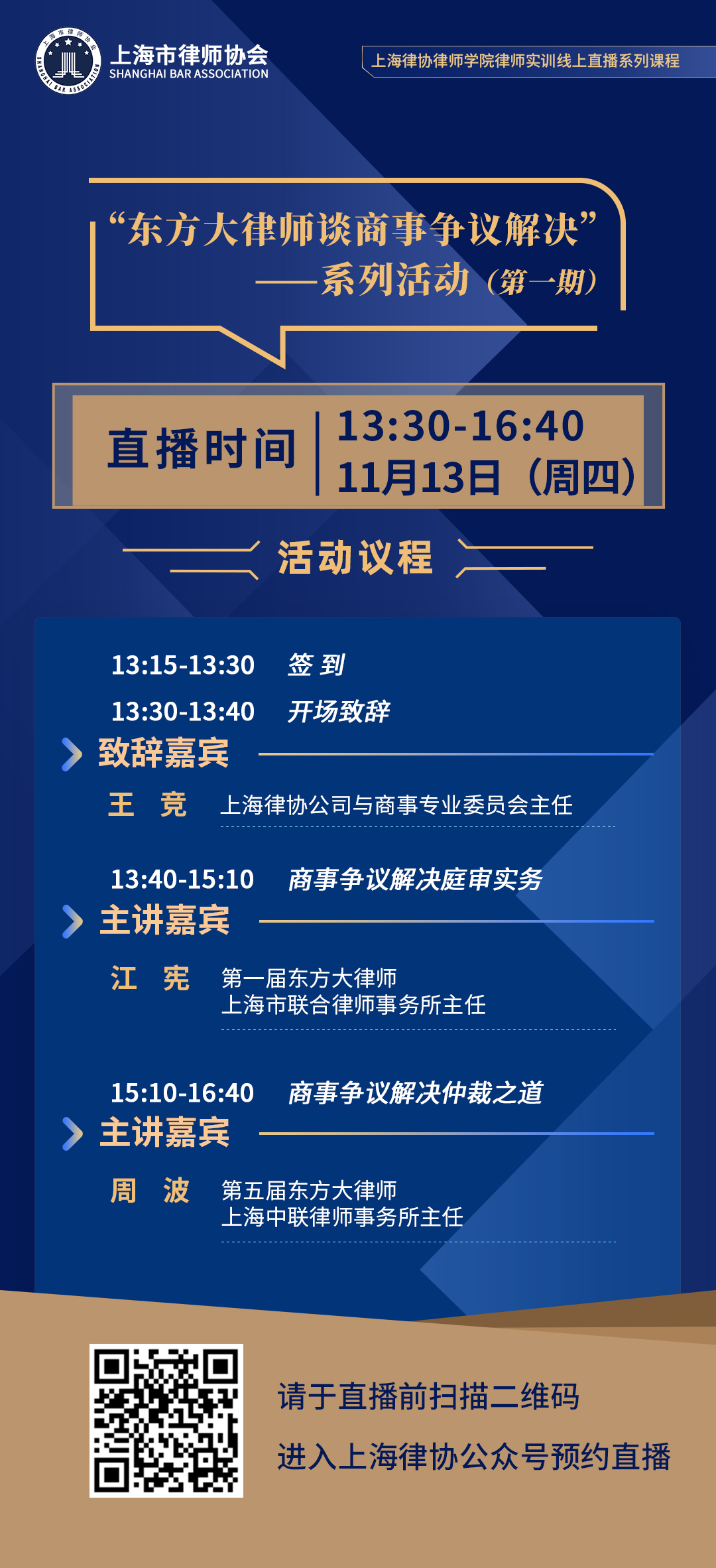 為縱深推進本市律師隊伍在商事爭議解決領域的專業化、高階化發展,打破實務難題壁壘,拓寬多元解紛思路,上海律協律師學院、公司與商事專業委員會依托“東方大律師”的專業標桿力量,聯合打造“東方大律師談商事爭議解決”系列活動。以“理論深度剖析+典型案例拆解+實戰經驗復盤”的立體模式,發揮東方大律師“傳幫帶”的引領效能,搭建起商事爭議解決智慧共享、能力共升的高端交流平臺,為上海建設國際一流法治化營商環境注入律師專業力量。第一期活動具體安排如下: