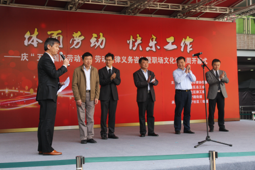 5月8日上午為慶祝“五一國際勞動節”,上海市律師協會勞動業務研究會、上海市閘北區律師工作委員會、上海市閘北區總工會、大寧路街道辦事處聯合舉辦“體面勞動,快樂工作——慶‘五一國際勞動節’職場文化活動周廣場法律咨詢活動”。大寧街道辦事處主任胡長春、閘北區律工委理事陸胤、區總工會副主席謝樹勤等領導出席活動并致詞。