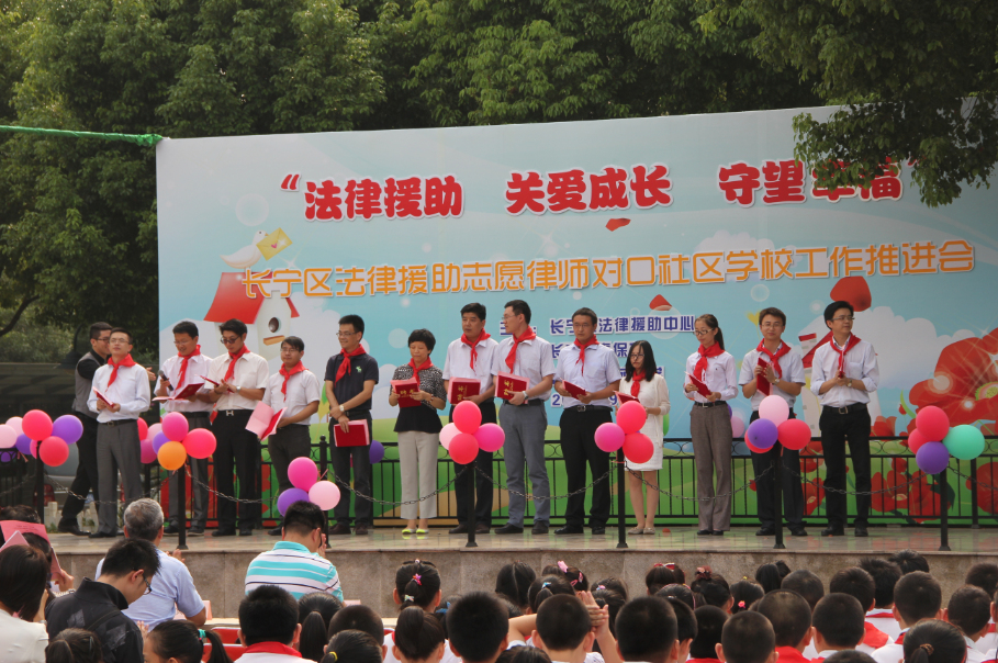 9 月4日 下午,長寧區法律援助中心在綠苑小學召開“法律援助關愛成長 守望幸福”為主題的法律援助志愿律師對結社區學校工作推進會,會上明確了由新華、天馳洪范、君悅、廣東國暉、海華永泰、城大、御宗、海耀、欣宏、公譽、養和、煒衡、中大、新滬、瑞富、凱茂16家律師事務所的20名律師對接10個街道社區和83個中小學、幼兒園。推進會在市法律援助中心副主任張銘、區教育局副局長吳玉雷、區司法局副調研員李為清、長寧區律工委主任劉習赟四人按動啟動球拉開了帷幕。志愿律師在會上做了鄭重承諾;市法律援助中心副主任張銘和區司法局副調研員李為清做了講話。