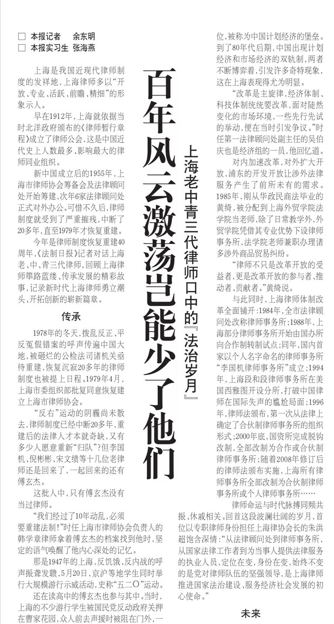 今年是律師制度恢復重建40周年,《法制日報》記者對話上海老、中、青三代律師,回顧上海律師篳路藍縷、傳承發展的精彩故事,記錄新時代上海律師勇立潮頭、開拓創新的嶄新篇章。