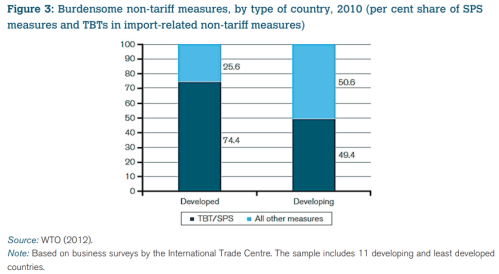 其后九年,WTO越來越沒有活力,各國紛紛尋求其他雙邊或區域性貿易協議,以至于2019年WTO上訴機構停擺。自關貿總協定時代,各國都選擇比較隱蔽的貿易保護措施,最常用的是技術壁壘(technical barrier),技術壁壘包括涉及人和動植物健康的SPS協議,以及其他技術事項的TBT協議。下圖來自WTO出版的非關稅措施指導文件,根據2010年數據,對國際貿易產生阻礙的非關稅措施中,發達國家74.4%是技術措施,發展中國家49.4%是技術措施,技術性措施TBT/SPS占壓倒性地位。