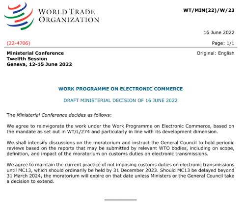 WTO各成員國在1998年確認電子傳輸不征關稅,但未定義什么是電子傳輸( “electronic transmissions” ),互聯網之前時代的電子傳輸也比較簡單,所以各成員國同意暫不征稅。當代跨境電子數據傳輸已無處不在,印度和南非等國家認為可以征稅,相關事務未定之前,在每兩年舉行一次的部長會議上,決定延遲兩年征稅,直到第12次部長會議。