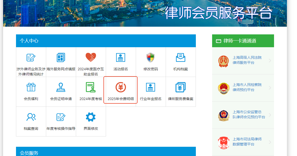 (一)律師事務(wù)所登錄東方律師網(wǎng)進(jìn)入“會員中心”后,點(diǎn)擊進(jìn)入菜單“2025年會費(fèi)明細(xì)”一欄即可顯示團(tuán)體會費(fèi)及個(gè)人會費(fèi),事務(wù)所按表格“總計(jì)”數(shù)額進(jìn)行交納;