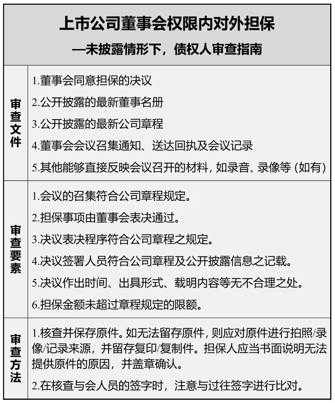 2.公司章程規定擔保需經董事會決議的,上市公司亦應公開披露相應董事會決議。如上市公司無法公開披露相應決議的,債權人可參考如下審查指南。需說明的是,鑒于上市公司不披露前述決議并不符合監管要求,亦違反常規,甚至不排除相關決議系偽造的可能,此種情形會加重債權人的審查義務,故債權人應對董事會會議的召集、召開程序及決議的真實性等事項予以特別關注。