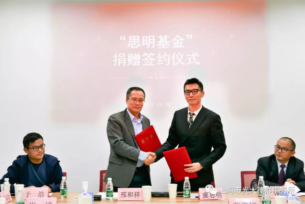 華東師大對外聯絡處處長邢和祥與虞思明律師共同簽署了”思明基金“捐贈協議,并向虞律師頒發了捐贈證書。虞思明律師回顧了自己在華東師大的求學經歷,師大豐厚的人文滋養,為他的法律執業積淀了獨特的底蘊。他期待,攜手華師大法學院,能把法律人守護正義、弘揚法治的強烈使命感和師大人的人文情懷、母校情結,傳遞下去,培養更多能推動中國法治建設的優秀師大法律人。