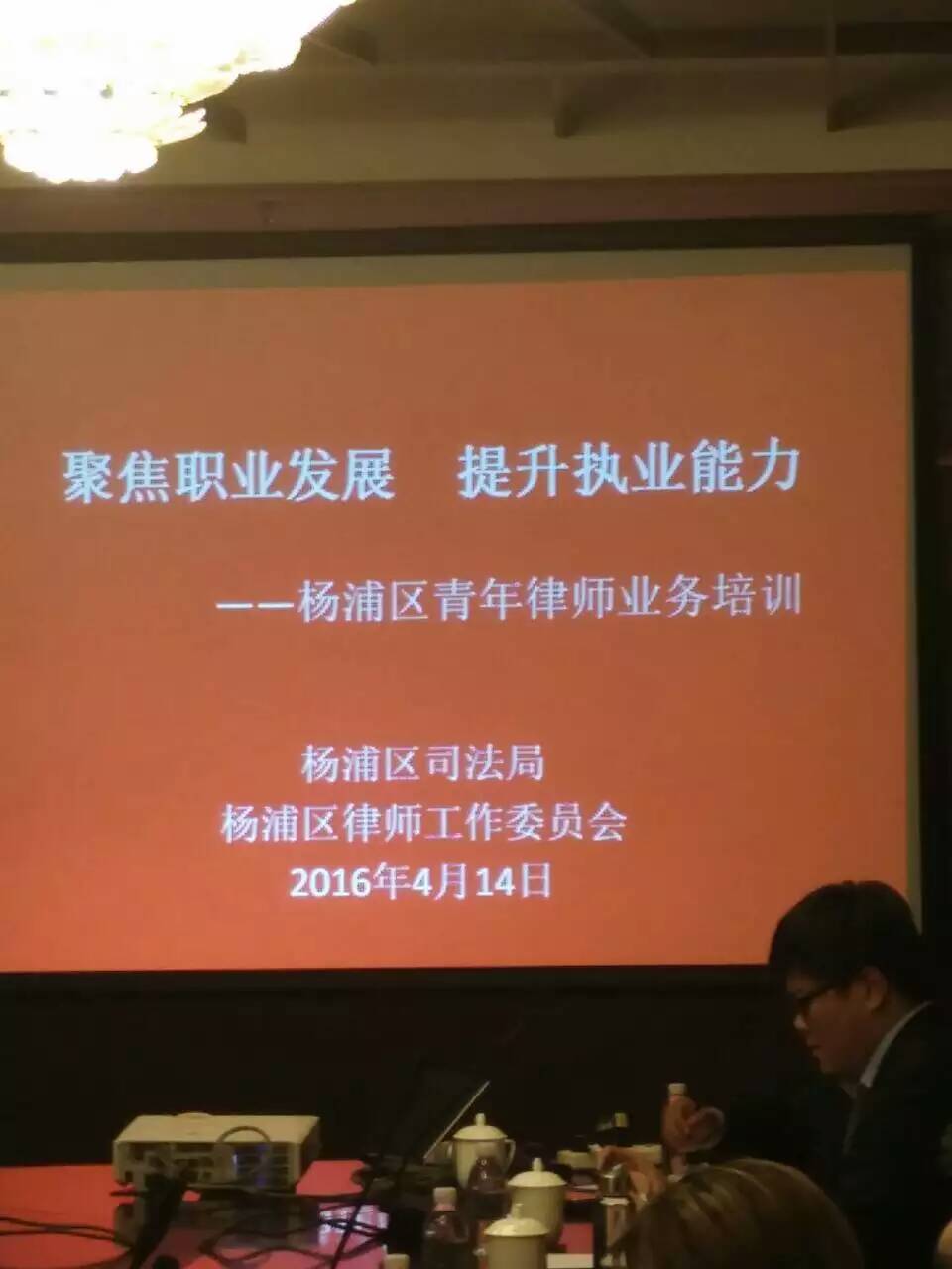 4月14日下午, 楊浦區(qū)司法局和區(qū)律師工作委員會主辦的2016年度區(qū)首屆青年律師業(yè)務(wù)培訓(xùn)班在錦雪苑成功舉行,培訓(xùn)取得了良好的效果。