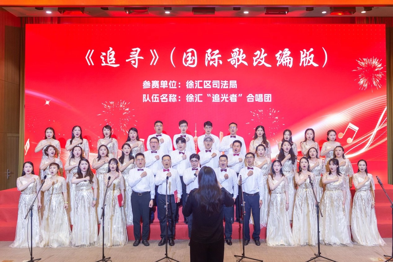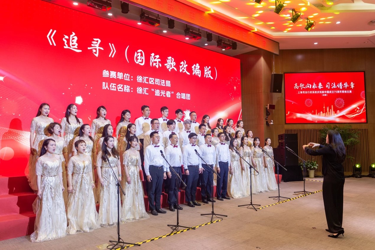 在上海市司法局隆重舉辦的“高歌向未來 司法譜新篇”——慶祝新中國成立75周年歌詠比賽的璀璨舞臺上,徐匯“追光者”合唱團以非凡的魅力和深情的演繹,贏得了全場觀眾與評委的熱烈掌聲與高度評價。這支由徐匯區司法局匠心獨運組建的合唱團,匯聚了來自司法局機關及區內多家優秀律所(如匯業、徳禾翰通、數科、隆安、恒隆、國巨等)的杰出歌唱才俊,他們以音樂為舟,歌聲為帆,共同駛向對藝術的無限熱愛與對法律事業的深切執著。