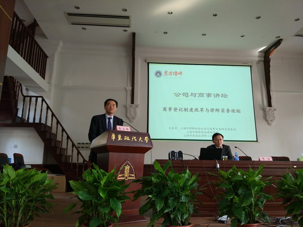 2016年3月25日至26日,由上海市律師協會公司與商事業務研究委員會、上海市律師協會律師學院、上海市黃浦區律師工作委員會聯合舉辦的為期兩天的“公司與商事講壇”之商事登記制度改革與律師實務論壇在華東政法大學小禮堂開講。本次論壇邀請到的主講嘉賓包括上海市工商局外資處韋浩處長、上海市商務委外資處陳昊副處長、上海高級人民法院資深商事審判專家陳克法官以及中國人民大學博士生導師劉俊海教授,兩天的“商事登記制度改革與律師實務論壇”分為四部分,每場活動均有近300名律師參加并與各位主講嘉賓進行積極地互動交流。